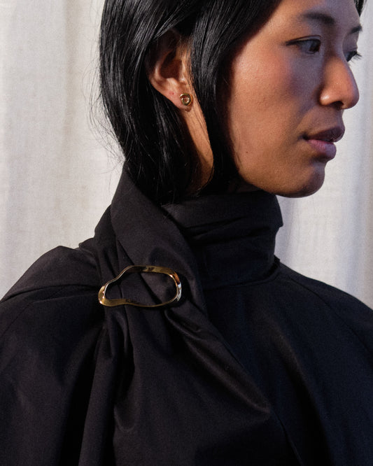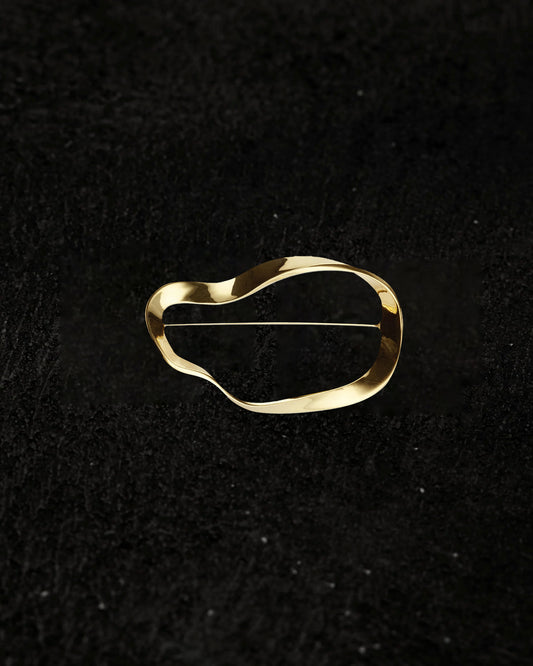 A gold vermeil brooch shaped with a fluid, sculptural curve that feels both organic and intentional. Featuring a high polish finish and secure pin backing, it reflects light with subtle warmth and movement. Wear it fastened to suiting, outerwear, or a knit for a refined point of focus. Finished with a softly contoured silhouette that feels timeless rather than decorative. material Gold vermeil is a thick layer of gold plated over solid sterling silver. Unlike standard gold plating, vermeil must meet specific thickness standards, offering greater durability and a richer finish while maintaining the weight and integrity of sterling silver beneath. details Made in NYC Gold Vermeil over .925 Sterling Silver Polish with a soft cloth Approx. 2.5" width