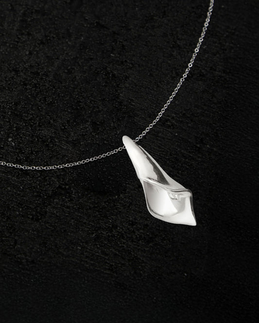 A sterling silver pendant shaped in a petite calla silhouette, sculpted with soft curves that sit close to the body. Featuring a high polish finish and suspended from a delicate chain, it reflects light with clarity while maintaining a restrained presence. Wear it alone at the collarbone for a subtle focal point or layered with longer chains for added depth. Finished with an adjustable clasp for versatile styling. material Sterling silver, also known as .925 silver, is composed of 92.5% pure silver blended with alloys for strength and durability. It offers a luminous finish that develops character over time and can be polished to restore its natural shine. details Made in NYC .925 Sterling Silver Adjustable 16" chain Mini calla pendant