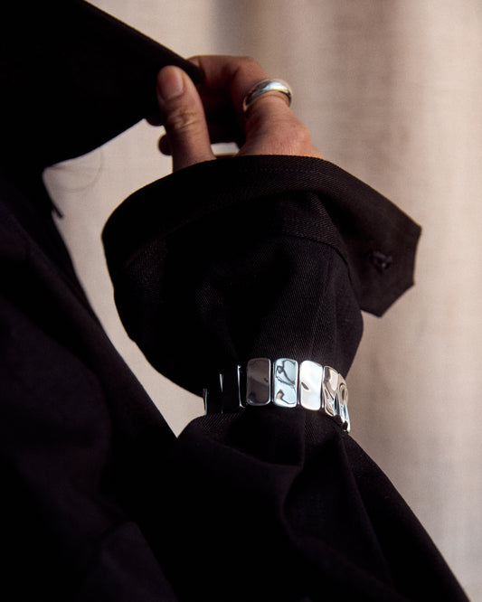 A sterling silver bracelet from the Ilona Collection, shaped with rippling, sculptural lines that echo the movement of water. Featuring stacked, fluid curves that create visual continuity and soft reflection, it wraps the wrist with a sense of balance and ease. Our version includes two additional links for an extended length, offering a more flexible, unisex fit. Wear it alone for a refined statement or layered with slimmer chains for contrast. Finished with a compact, articulated form that feels substantial yet considered. material Sterling silver, also known as .925 silver, is composed of 92.5% pure silver blended with alloys for strength and durability. It offers a luminous finish that develops character over time and can be polished to restore its natural shine. details Handmade in NYC.925 Sterling SilverMeasures 0.7" wideExtended length with two additional links for adjustable fit