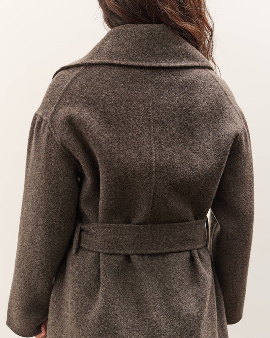 A wide leg pant with a mid rise fit and a relaxed leg. Made from a mid-weight wool blend woven fabric in a salt and pepper gray. Detailed with front pleats at the waist, zip fly, hook and bar closure, and belt loops. A smart and easy every day pant.