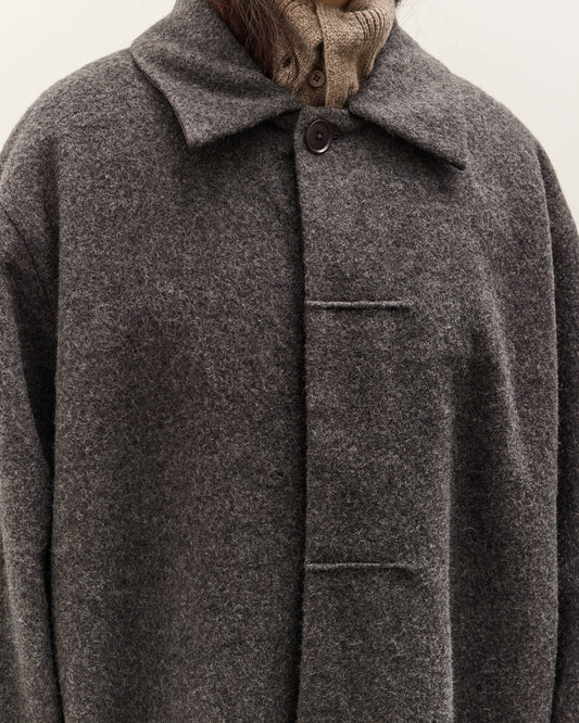 A mid-length coat cut in a boxy cocoon silhouette for comfortable layering. Made from a lightweight and soft wool blend. It is moisture wicking and temperature regulating. This thickness is best for keeping you warm during the fall and early winter. Features a spread collar, drop shoulders, and exaggerated sleeve cuff. Button closure is embroidered with line detailing and underlined with cotton lining. A sleek and minimal design with on-seam side pockets. fit Cara is 5'6" and typically wears an S in tops. She's wearing the size XS here for a regular fit. This is a unisex style. Size XS is equivalent to our women's size S. XS – Bust: 54", Sleeves: 32", Waist: 55", Length: 44"S – Bust: 56", Sleeves: 32.5", Waist: 57", Length: 44.5"M – Bust: 58", Sleeves: 33", Waist: 59", Length: 45"S – Bust: 60", Sleeves: 33.5", Waist: 61", Length: 45.5" details Made in small batch in Guangzhou City, China80% Wool, Lining: 100% CottonDry clean recommended