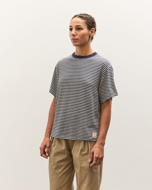 A striped T-shirt with a loose knit construction in navy and natural tones. Featuring a relaxed silhouette with slightly elongated short sleeves and a contrast ringer collar for a sport-inspired look. Easy to wear on its own with denim or layered under a jacket. Finished with clean seams and a flat hem. fit Kass is 5'9" and typically wears a Small in tops. She's wearing the size Small here for a relaxed fit. Relaxed fit through the body. Take your usual size for a draped fit or size down for a closer cut. measurements Size S: 24.75" length, 18.5" shoulder, 42.5" chest, 7.75" sleeveSize M: 25.75" length, 19.25" shoulder, 44.5" chest, 8.25" sleeveSize L: 26.75" length, 20" shoulder, 46.5" chest, 8.75" sleeveSize XL: 27.75" length, 20.75" shoulder, 48.5" chest, 9.25" sleeve details Made in Portugal100% CottonMachine wash cold