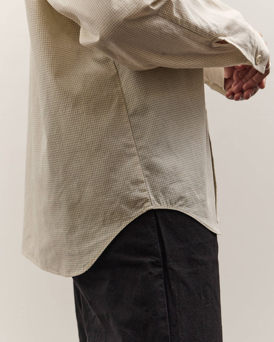 A loose-fitting shirt with slightly dropped shoulders, relaxed sleeves, pleated cuffs with single-button closure, pointed collar, button front, and curved hem. Cut from yarn-dyed cotton broadcloth with a fine square grid motif, finished for a dry, papery texture. Woven in Hyogo, Japan, the fabric balances structure with lightness. Finished with clean topstitching and reinforced details for longevity. fit Kass is 5'9" and typically wears a size S or M in tops. She's wearing the size XS here for a regular fit. This style is listed in men's sizing. A men's size S is equal to a women's size M. measurements Size XXS: 47.25" chest, 17.75" shoulder, 26.5" length, 22.5" sleeveSize XS: 49.5" chest, 19" shoulder, 28" length, 23.25" sleeveSize S: 51.25" chest, 19.75" shoulder, 29.5" length, 24" sleeveSize M: 52.75" chest, 20.5" shoulder, 31" length, 24.75" sleeveSize L: 55" chest, 21.75" shoulder, 31.75" length, 25.5" sleeve details Made in JapanHistoric Grid – 100% Cotton broadclothYarn-dyed, woven in HyogoMachine wash cold or dry clean