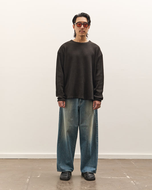 A workwear-inspired coverall crafted from Japanese raw denim, garment-dyed in Kakishibu, a natural persimmon tannin dye that deepens and gains luster with wear. The silhouette is relaxed with dropped shoulders, a boxy body, and a slightly elongated length for easy layering. Designed with large patch pockets, metal hardware that will develop a patina over time, and reinforced seams throughout. Each piece is hand-dyed by artisans in Kyoto, resulting in nuanced variations in tone and texture unique to every garment.