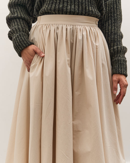 A high-waisted and voluminous pleated skirt with an A-line silhouette and full length. Crafted out of a lightweight, yet crispy, and smooth cotton fabric. Cool, comfortable, and breathable. Finished with a single button and concealed back zip closure. fit Cara is 5'7" and typically wears a size 26 in bottoms. She's wearing the size Small here for a regular fit. Style is running true to size. Approximate Measurements XS - Waist: 24", Open Hip, Length: 33"S - Waist: 25", Open Hip, Length: 33.5"M - Waist: 27", Open Hip, Length: 34"L - Waist: 28", Open Hip, Length: 34.5" details Made small batch in Guangzhou City, China 60% Nylon, 40% CottonHand wash cold, lay flat to dry