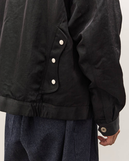 The Titan bomber jacket features a cropped loose silhouette with dropped shoulders and a flat hemline. Made from a black nylon lightweight yet substantial hand, suitable for all year round. Detailed with billowed front pockets, side pockets, and a detachable collar strap. fit Ellery is 6'0" and typically wears a Medium or Large in tops. He's wearing the size Large here for a relaxed fit. Relaxed through the body with room for layering. Take your usual size for a comfortable fit. measurements Size XS: 24.5" length, 22.75" shoulder, 46" chest, 22" sleeveSize S: 25.25" length, 23.5" shoulder, 48" chest, 22.5" sleeveSize M: 26" length, 24.25" shoulder, 50" chest, 23" sleeveSize L: 26.75" length, 25" shoulder, 52" chest, 23.5" sleeveSize XL: 27.5" length, 25.75" shoulder, 54" chest, 24" sleeveSize XXL: 28.25" length, 26.5" shoulder, 56" chest, 24.5" sleeve details Made in Portugal100% NylonMachine wash cold