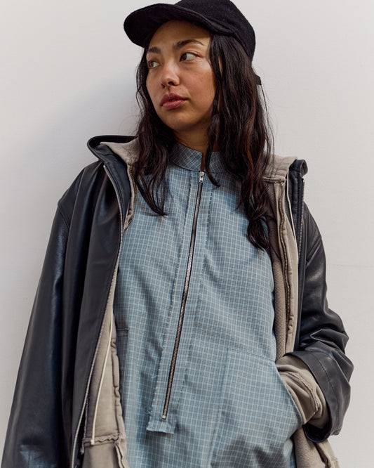 A sleeveless zip dress cut with a knee length finish and high neckline. Made from a lightweight blue plaid cotton with a slight structure that highlights the A-line silhouette. Features a partial long zip front, two patch pockets, and collar with exposed seams and irregular topstitching. Finished with raw edge armholes. fit Beija is 5'9" and typically wears a size Small or Medium in tops. She's wearing the size small here for a regular fit. details Made in Ukraine100% cottonMachine Wash Cold