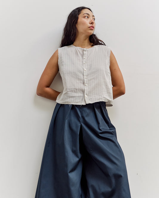 A fitted cropped sleeveless blouse with a round neckline and flat hemline. Made from a light linen viscose striped shirting with a smooth breathable feel. Features a front button closure with mother of pearl buttons and finished with revert rolled raw hems. fit Beija is 5'9" and typically wears a size small/medium in tops. She's wearing the small here for a regular fit. details Made in Portugal52% linen 47% viscoseDry clean