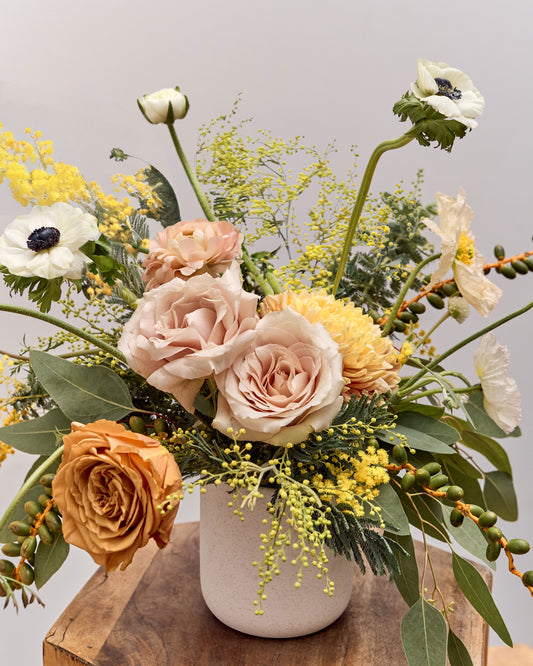 AVAILABLE 2/13 or 2/14 A blushing and bright centerpiece inspired by an unabashed sunrise. Grounded with textural mimosa, this floral arrangement is designed to capture the essence of the first bits of early morning light. Tonal blooms nestle among the greenery with soft bursts of feminine beauty. A thoughtful gift to celebrate an occasion or to beckon to the approaching spring season ahead. Available in limited quantities for in-store pickup or local Seattle delivery on Friday, February 13 or Saturday, February 14. 20% of profits of each floral arrangement will be donated to Northwest Immigrant Rights Project, supporting direct legal services and advocacy for immigrant and refugee communities across the Pacific Northwest. FLOWER / GREENS AVAILABILITY Each of our arrangements is a unique and handmade expression. As flowers and plant material are a product of nature, their availability is subject to change depending on variables like climate and seasonality. We may make substitutions within the same design palette. Arrangement includes a ceramic vase (color may vary). Pictured here: mimosa, garden roses, anemones, poppies, chrysanthemum, ranunculus, seeded eucalyptus, date palms