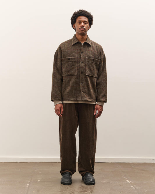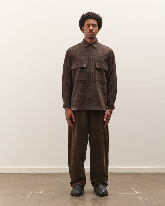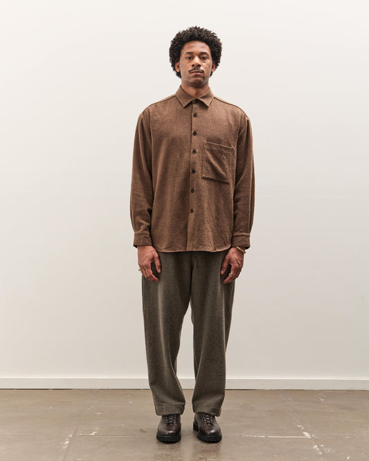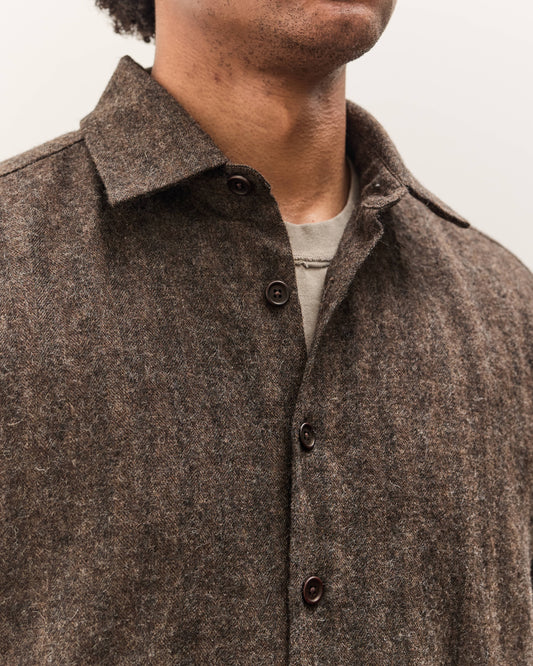 A flat hem button down shirt cut with a straight silhouette and clean lines. Featuring a relaxed chest, pointed collar, and squared cuffs. Cut from an undyed organic wool herringbone cloth that blends natural shades of brown and charcoal. The yarn was spun in Yamagata and woven in Ichinomiya, Japan. The cloth was washed and tumbled in the finishing to impart a softer raised texture with a lofty and dry hand. Finished with corozo buttons, french seams, single chest pocket, and flat hem. fit Chukwuma is 6'2" and typically wears a size Large in tops. He's wearing the size Large here for a regular fit. measurements XS: Chest 21", Shoulder 18.75", Length 27.25"S: Chest 22", Shoulder 19", Length 28.25"M: Chest 23", Shoulder 20", Length 29.25"L: Chest 24", Shoulder 21", Length 29.5"XL: Chest 26", Shoulder 22", Length 30.5" details Made in San Francisco100% WoolCare Instructions