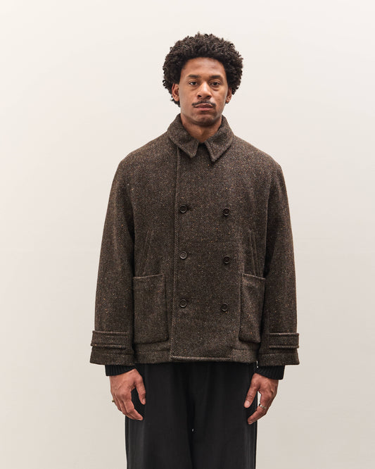 A double breasted coat with a wide, straight silhouette and generous cut through the body. Featuring a pointed collar, side welt pockets, and interior pocketing. Cut from a lofty wool herringbone cloth woven in County Donegal, Ireland by one of the few remaining authentic tweed mills. This classic pattern blends custom shades of brown and charcoal yarns for a rich depth of tone. Finished with corozo buttons, full lining, and clean binding inside. fit Chukwuma is 6'2" and typically wears a size Large in tops. He's wearing the size Large here for a regular fit. measurements XS: Chest 24", Shoulder 19.5", Length 28.5", Sleeve 30.5"S: Chest 25.25", Shoulder 20", Length 29.25", Sleeve 31.5"M: Chest 26.5", Shoulder 20.5", Length 30", Sleeve 32.5"L: Chest 27.75", Shoulder 21.25", Length 31", Sleeve 33.5"XL: Chest 29", Shoulder 22", Length 32", Sleeve 34.5" details Made in San Francisco100% WoolSpot clean or dry clean only