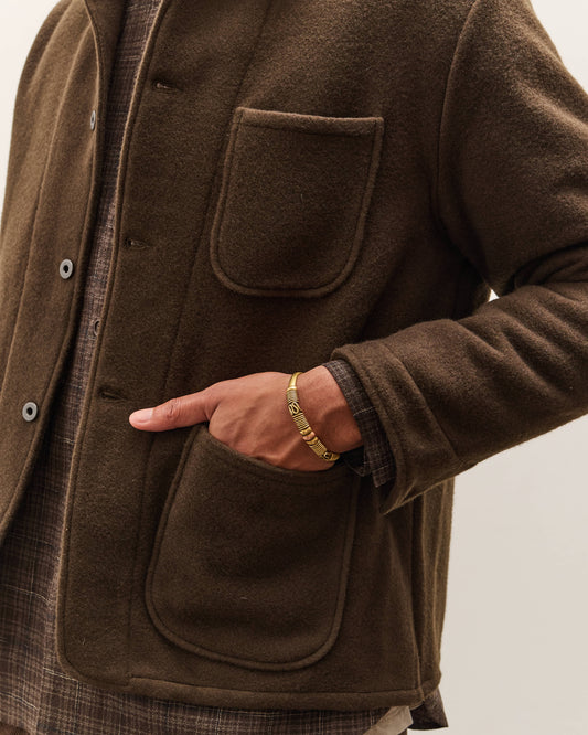 A chore style jacket with a straight fit and three large front patch pockets. Featuring a pointed collar, corozo button front, and reinforced construction throughout. Cut from a double weave blanket cloth originally developed in Ichinomiya, Japan by a textile designer over 30 years ago. This thick fabric uses a cotton core surrounded by wool, then heavily brushed on both sides for loft and softness. The result is a substantial yet pliable cloth with a very soft hand and unstructured drape. Finished with clean binding inside. fit Chukwuma is 6'2" and typically wears a size Large in tops. He's wearing the size Large here for a regular fit. This style is running slightly small. If between sizes, take the larger. measurements XS: Chest 21.75", Shoulder 17.75", Length 27", Sleeve 29.5"S: Chest 23", Shoulder 18.5", Length 27.75", Sleeve 30"M: Chest 24", Shoulder 19.5", Length 28.5", Sleeve 30.75"L: Chest 25.25", Shoulder 20.5", Length 29", Sleeve 31.5"XL: Chest 26.5", Shoulder 21.5", Length 29.5", Sleeve 32.25" details Made in San Francisco76% Wool 24% Organic CottonSpot clean or dry clean only