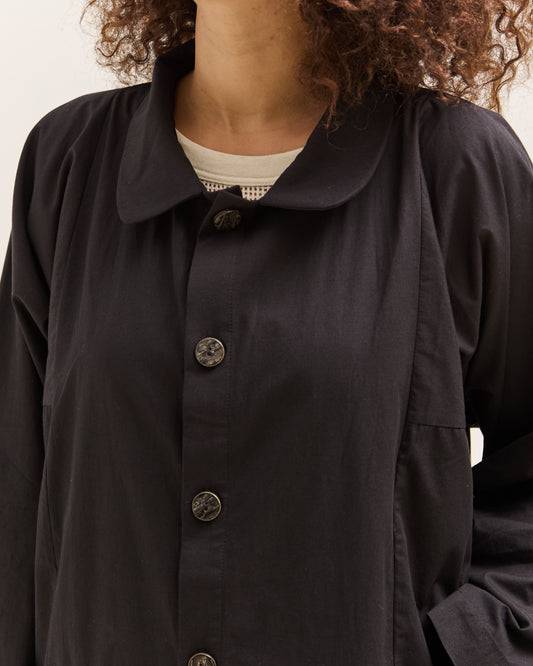 A farmer shirt with a clean, utilitarian shape cut in organic cotton poplin and finished in a deep charcoal black tone. Featuring a relaxed silhouette with a smooth hand feel, a curved hem, and an airy structure that lends itself to year round wear. The drape stays easy without feeling oversized, making it simple to layer or wear on its own. Finished with precise stitching, subtle texture that comes through the tightly woven poplin, and shell buttons. fit Lila is 5'8" and typically wears an XS in tops. She's wearing the size Small here for a regular fit. If between sizes, take the smaller. measurements Small, Back 31" Chest 46" Sleeve 24.75" Front 29"Medium, Back 32" Chest 50" Sleeve 25.5" Front 30"Large, Back 33" Chest 54" Sleeve 26.25" Front 31" details Made in IndiaOrganic Cotton PoplinHand wash cold or line dry