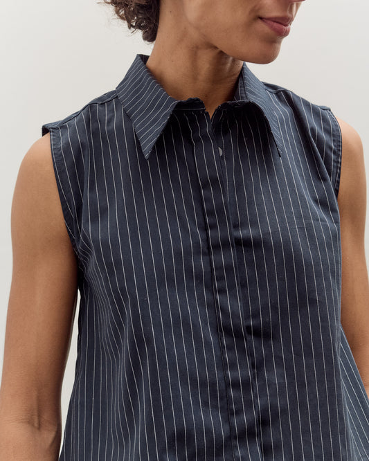 Introducing the Ellis Top—a study in precision, restraint, and quiet elegance. Cut with clean, architectural lines, this simple sleeveless silhouette skims the body with effortless refinement, striking a balance between structure and ease. A clean collar at the neckline and covered button placket highlight the absence of excess detail, and allow the craftsmanship to speak for itself. The Ellis Top feels both modern and timeless—an essential piece that elevates everyday dressing with its minimal clarity and understated sophistication. fit Kass is 5’9” and typically wears size Small in tops. She's wearing the size small here for a loose fit. measurements Size XS/S: Width 18.5", Length 19", Arm Opening 20"Size M/L: Width 20", Length 20", Arm Opening 21" details Made in California100% Deadstock Japanese PoplinCold gentle wash line dry finish with brief low heat tumble