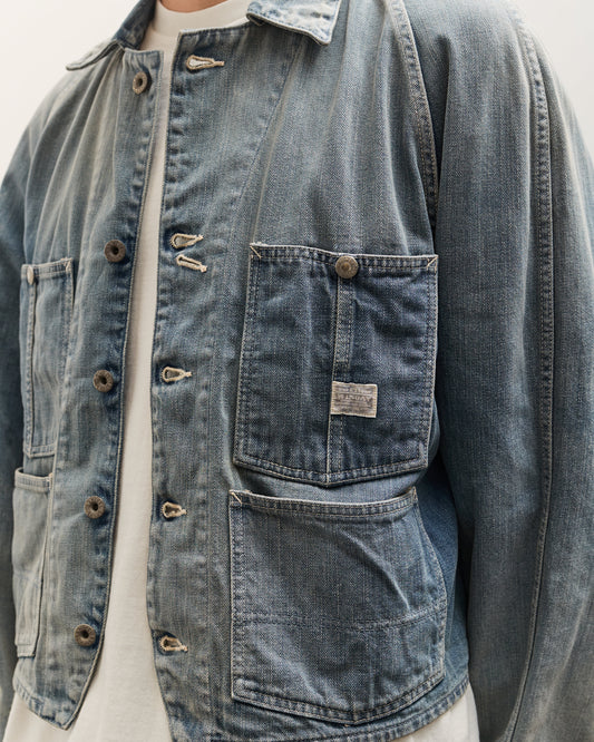 A cropped chore jacket with a compact, boxy silhouette and a worn-in attitude. Featuring a shortened body with a tight button stance, scaled pockets set close to the placket for a condensed layout, and 12oz denim construction engineered for everyday structure. Finished with intentional distressing that shows frayed edges and abrasion, plus indigo dye that will transfer and develop character with wear. fit Dane is 6’0” and typically wears a size L in tops. He wears size 3 here for a regular fit. measurements size 1: length 18.5", sleeve 30.3", bust 43.7", hem 41.3", cuff 5.1", neck 18.1"size 3: length 20.1", sleeve 32.7", bust 46.9", hem 44.5", cuff 5.5", neck 18.9"size 5: length 21.7", sleeve 35.0", bust 50.0", hem 47.6", cuff 5.9", neck 19.7" details Made in Japan100% CottonIndigo dyed, color may transferDistressed finish is intentional and not a defect