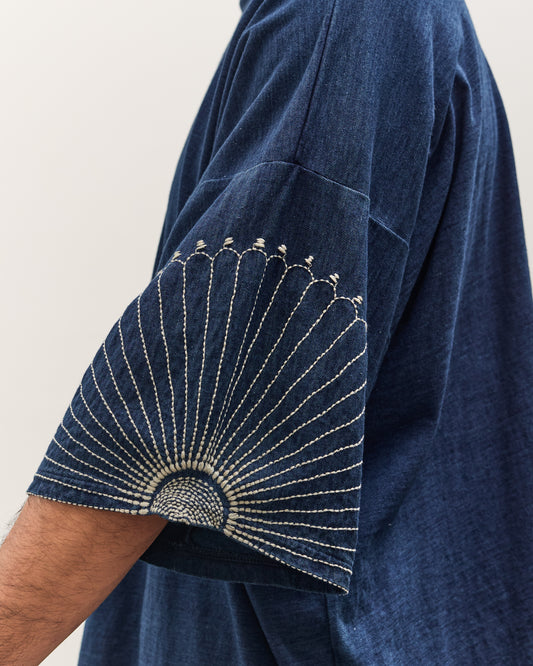 An oversized short-sleeve T-shirt with a generous, draped silhouette and hand-finished character. Featuring dropped shoulders, wide sleeves, and FUROSHIKI-style embroidered motifs applied with tonal thread for a subtle textural effect. Finished with a classic ribbed crew neckline, straight hem, and soft surface from repeated indigo dyeing. Cut from midweight cotton jersey that will fade and patina with wear. fit Dane is 6’0” and typically wears a size L in tops. He wears size 3 here for a relaxed, oversized fit. measurements size 1: length 28.7", shoulder 26.4", chest 53.5", sleeve 9.4"size 2: length 29.9", shoulder 27.6", chest 55.1", sleeve 9.8"size 3: length 31.1", shoulder 28.7", chest 57.5", sleeve 10.2" details Made in Japan100% Cotton JerseyIndigo dyed, color may transferHand wash cold, lay flat to dry