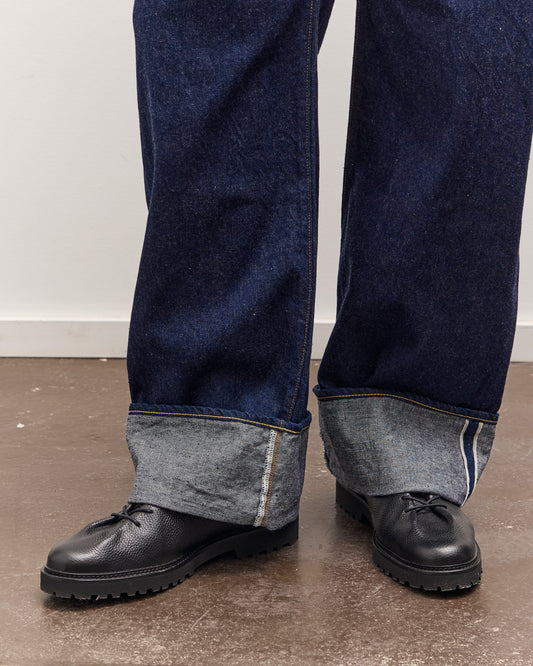A high-rise, 5-pocket denim pant from Kapital, rendered in 12oz selvedge indigo denim that develops character over time. Features a rounded waist and deep rise for a flattering elevated fit, paired with a straight leg that offers subtle structure with ease. The indigo-dyed denim is accented by a natural leather brand patch, contrast stitching, and classic metal hardware, combining heritage denim craftsmanship with a contemporary silhouette. Finished with a zipper fly and tonal details that keep the look clean and versatile for everyday wear. fit Jadan is 6'5" and typically wears a size 38 in bottoms. He is wearing the size 38 here for a slim fit that will loosen with wear. This design sits high on the waist with a deep rise and a straight, slightly relaxed leg — offering a balanced silhouette that respects the original “Momonroe” DNA while giving a structured yet wearable shape. details Made in Japan100% Cotton (12oz selvedge denim)Indigo dyed5-pocket constructionZipper flyNatural leather brand patchContrast stitching