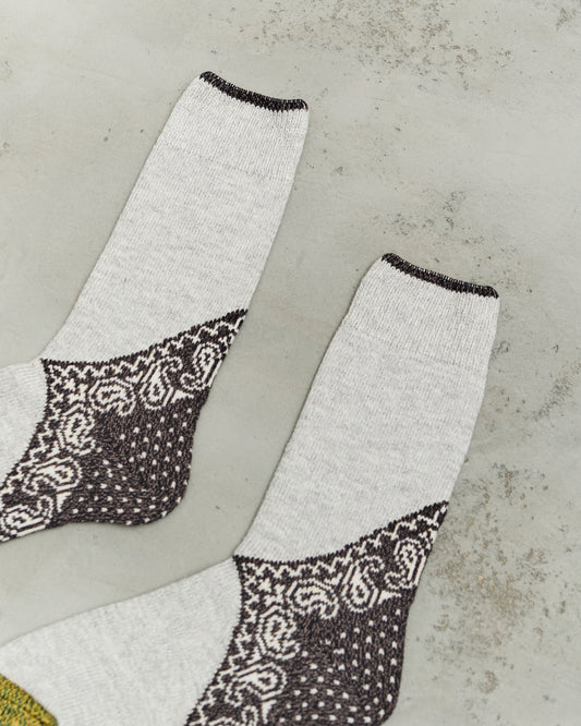 A pair of crew socks with bandana heel detail in an allover woven, midweight jacquard knit. Finished with a color-blocked ribbed toe and ribbed cuff. Unisex and available in other colors. See all available Kapital socks. details Made in Japan80% cotton, 15% acrylic, 3% polyurethane, 2% nylonOne Size Fits MostUnisex: < MENS US10Womens: US6 - US10Hand Wash