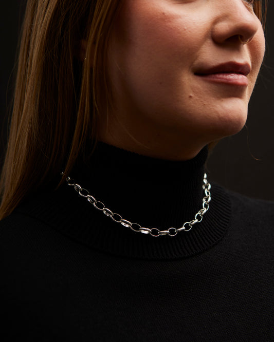 An oversized, elongated rolo chain necklace with nice rounded links made from solid sterling silver. It can be clasped at any of the links so you can wear it at many lengths. A versatile piece for layering, and it looks especially nice doubled up or worn with other heavy chains. details Fabricated and hand-finished in SpainSterling silver8 mm chain, 17" longAdjustable by hooking the clasp on any link