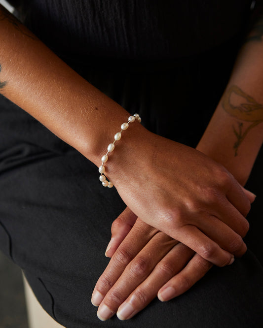 Freshwater rice pearls and tube beads are constructed to mimic a ball chain. details Made in VancouverFreshwater pearls with a sterling silver ball clasp and beads.Total length is 7” or 18cm.