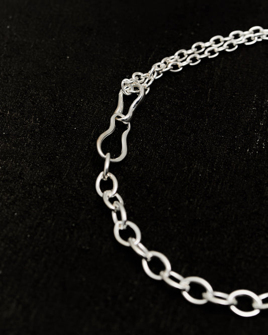 A two in one piece of jewelry that is a necklace or can be taken apart at the hinged link to make a bracelet. Designed with a large fluidly shaped hook and eye closure. Made from a Silver plated Brass (15 Microns) that is nickel free and hypoallergenic. details Fabricated and hand-finished in SpainSilver plated Brass (15 Microns)16.5" Length7.5" of chain is remove-able