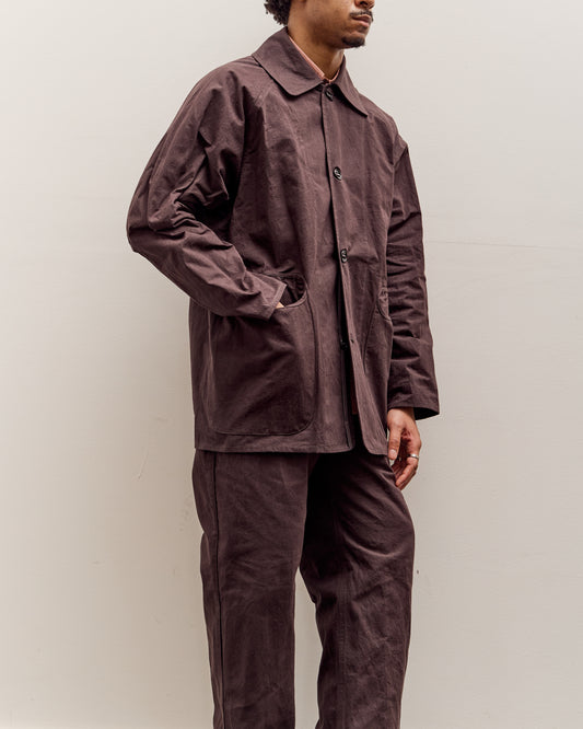 A loose-fitting shirt designed with a straight cut and flat hemline. Made with a lightweight cotton linen parachute cloth and woven on a wooden shuttle loom in Shizuoka, Japan. This fabrication was over-dyed with mangosteen pigment as well as local woods which impart tannins into the fabric that later react to the iron-rich mud dip dye, developing a dark brown color. The color is designed to evolve with exposure to sunlight and wear. Shirt details include include a classic stand collar, button front placket and large left chest pocket. fit Himi is 6'0" and typically wears a size L in tops. He's wearing the size L here for a relaxed fit. details Made in Japan70% cotton 30% linen high-density parachute clothHand wash cold, lay flat to dry