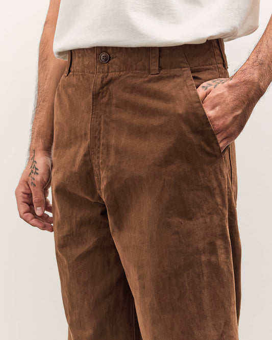 A classic fitting trouser engineered to be a uniform favorite that can be dressed up or styled casually. This pant features a comfortable fit through the seat, and a wide straight leg. Cut from a high count heavy cotton twill in camel. Finished with rear flap welt pockets, side pockets, coin pocket, and a zipper fly. Includes interior drawstring at the waist for sizing flexibility. fit Dane is 6'0" and typically wears a size 34 in bottoms. He's wearing the size Medium here for a relaxed fit. This is a relaxed style with an adjustable drawstring waist. details Made in USA 100% CottonMachine Wash Cold