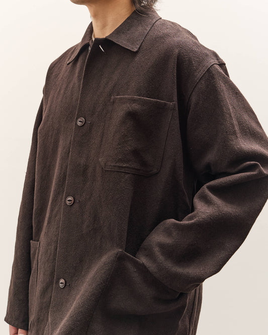 A workwear-inspired coverall crafted from Japanese raw denim, garment-dyed in Kakishibu, a natural persimmon tannin dye that deepens and gains luster with wear. The silhouette is relaxed with dropped shoulders, a boxy body, and a slightly elongated length for easy layering. Designed with large patch pockets, metal hardware that will develop a patina over time, and reinforced seams throughout. Each piece is hand-dyed by artisans in Kyoto, resulting in nuanced variations in tone and texture unique to every garment.