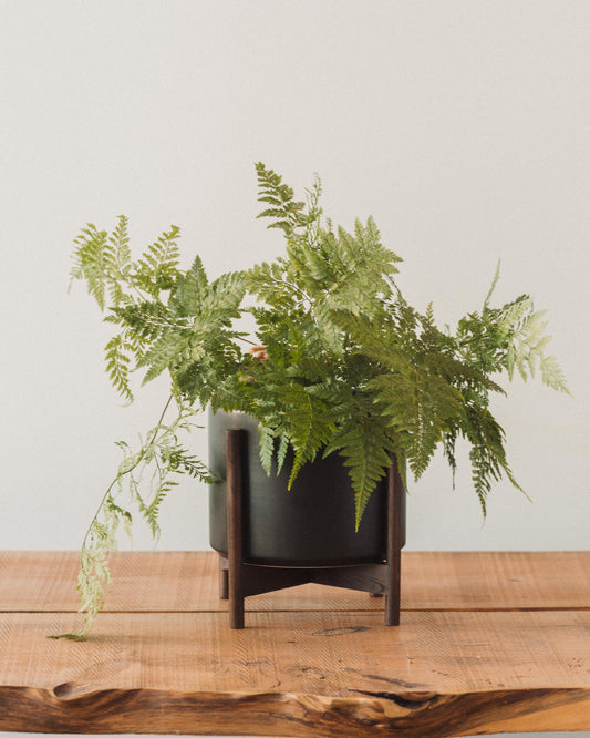 Made from premium high-fired stoneware using traditional techniques, these Mid-Century planters from LBE have a timeless design that will complement any interior style. Paired with a handcrafted hardwood stand made from reclaimed wood and finished with a natural oil. Wood stand can be inverted for more height. See all available sizes in this style here. This style does not have a drain hole. We recommend keeping your plant in its plastic grower's pot and placing it inside this larger decorative pot. This will ensure that your plant will have a healthy drainage system. We only recommend potting drought-resistant plants directly into pots without a drain-hole, like cacti or succulents. Dimensions Cylinder: 12.6" x 13.4" x 13" HighOverall: 15.5" x 20" Ideal for 10" and 12" nursery pots. details ImportedCeramic + WoodCompletely WaterproofNo Drain hole