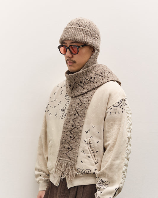 A warm winter cap from Kapital knit in a chunky 3G wool that gives the piece its sculptural shape and soft textured surface. Featuring the brand’s signature Gale construction with a gently curved crown and a built in scarf that can be styled in a variety of ways. The knit has a dense yet comfortable feel that holds warmth while remaining breathable. Finished with subtle rib detailing and Kapital’s playful approach to cold weather accessories. fit One size. Designed with natural stretch and a flexible brim that adapts to different head shapes. Fits comfortably without feeling tight. details Made in Japan100% WoolDry clean only