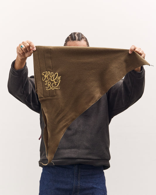 A wool babushka scarf cut with a thick padding along the edge that frames the face or neckline. Featuring a gold script embroidery on one side and finished with a clean baby hem edge. This piece can be worn as a head scarf or around the neckline. View all Kapital Scarves here. details Made in Japan90% wool, 10% nylon; embroidery 100% polyesterDry or Spot Clean
