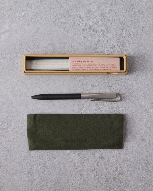 Individually crafted solid metal ballpoint pen with a unique U-clip. The entire body is cut from solid aluminum while the clip is cut from solid brass. We found this combination gives the pen the solid feeling we love without being heavy. Included ink cartridge: SXR-5 0.5mm waterproof ink. Instead of a plastic or rubber grip, there are fine record-like lines inscribed into the pen body. Lines cut into the clip give just the grip needed and also create a subtle graph pattern. It feels refined: less like a tool and more like an instrument. This pen embraces traditional craft but with the goal of blending it into everyday contemporary life. Satisfying mechanicsThe clip is also the button that exposes the tip of the ballpoint. Pushing on the top exposes the pen tip, while pressing on the front retracts it. details Made in JapanSolid Aluminum & Brass1 x 14.7 x 1.4 cm / 0.4" x 5.9" x 0.6" Care Instructions