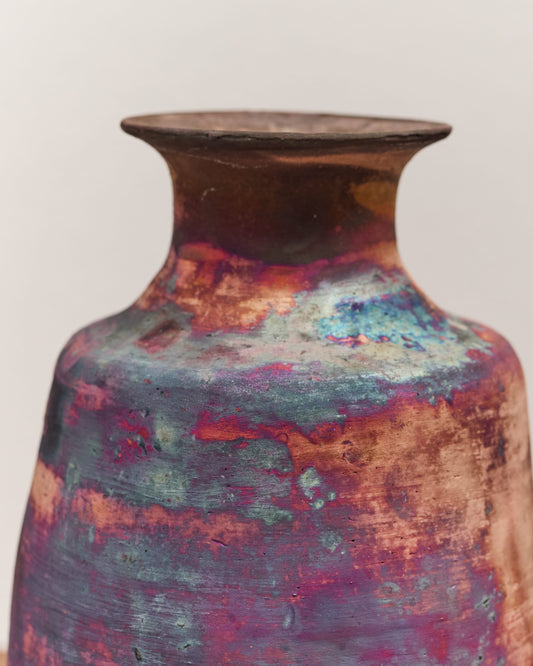 Patagonia's amazing hand-made pottery. The beautiful colors are created by the reaction between the metal elements in the glaze and the surrounding air. The glaze itself is made from Patagonian mountain soil, which is left to ferment for two to three months. This raku technique was first used by a Japanese woman who traveled to Patagonia in the 1970s, and it has since been passed down to her disciples. SHIPPING NOTICE Due to the delicate nature of handmade ceramics, all art pieces shipped are final sale. Please contact us if you have questions about the piece before purchasing. DETAILS Made in PatagoniaCeramicWidth 15.5Cm Height 25Cm