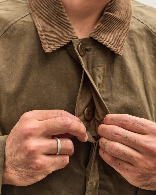 A long, streamlined coat designed for transitional layering with a clean, minimal profile. Featuring a slightly relaxed fit, drop shoulders, side seam pockets, and a single-button front closure. Finished with a straight hem, back vent for ease of movement, and a smooth full lining. Cut from a midweight waxed cotton with a subtle brushed texture for warmth and structure. Also available in Black. fit Dane is 6’0” and typically wears a size Large in tops. He wears the size Large here for a regular fit. measurements XS: bust 47", sleeve 33", length 43"S: bust 49", sleeve 34", length 44"M: bust 51", sleeve 35", length 45"L: bust 53", sleeve 36", length 46"XL: bust 55", sleeve 37", length 47" details Made in Guangzhou, ChinaSmall Batch Production100% Waxed CottonSpot Clean, Dry BrushM