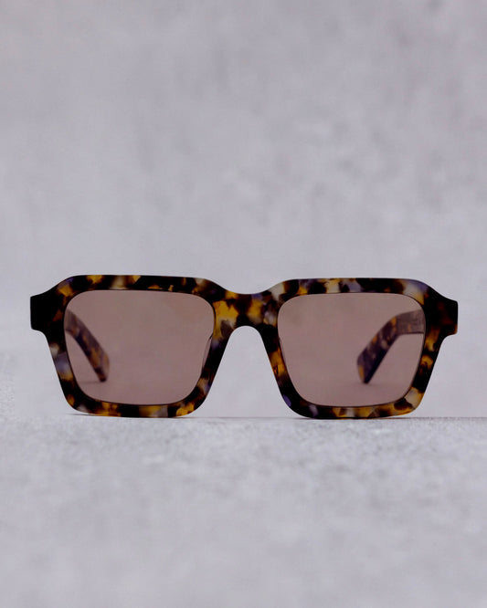 Sunglasses in a rounded rectangular shape with a bold thickness, handmade from an eco friendly cellulose acetate, cotton and wood blend that is sustainably sourced and biodegradable. Finished with stainless steel cores for strength and flexibility paired with extra sturdy and durable zinc-free barrel hinges. Optical-quality nylon lenses with 100% UV protection. Unisex. Also available in Black. details Made in ChinaBrain Dead case and cloth includedLens width - 53 mm Bridge width - 20 mm Temple length - 150 mm