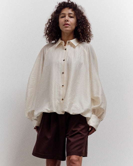 This oversized shirt is crafted from a fluid, subtly sheer fabric that drapes beautifully on the body. It features a balloon-style back with a longer hemline at the rear for added movement and volume. Designed with a classic pointy collar, front button closure, and voluminous sleeves gathered into wide cuffs with two small buttons. A standout piece on its own or worn as a set with the matching trousers. fit Lila is 5’8” and typically wears a size XS in tops. This style has a regular fit and is available in one size. measurements Shoulder 22", chest 26", waist 23", length 25", sleeve 31" details Made in Spain80% Lyocell, 20% Polyamide. LENZING TM LyocellDry clean only