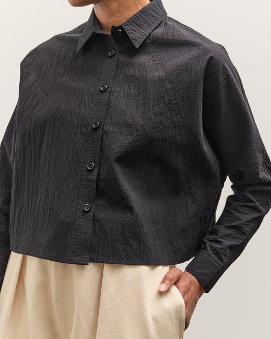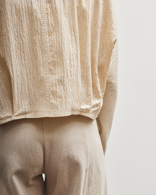 A refined dress shirt with a fluid, architectural silhouette that reads tailored yet relaxed. Featuring long sleeves and a hidden side panel that creates a subtle cocoon shape through the back. Finished with a concealed front placket, a classic slightly exaggerated collar, and button cuffs. Cut from a soft sand washed cotton that has a gentle crinkle and comfortable breathability. fit Lila is 5’8” and typically wears a size XS in tops. She wears the size XS here for a relaxed fit. measurements XS: bust 54", sleeve 31", front length 29", back length 31"S: bust 56", sleeve 32", front length 29.5", back length 31.5"M: bust 58", sleeve 33", front length 30", back length 32"L: bust 60", sleeve 34", front length 30.5", back length 32.5"XL: bust 62", sleeve 35", front length 31", back length 33" details Made in Guangzhou, ChinaSmall Batch Production100% CottonHand wash cold, Lay flat to dry