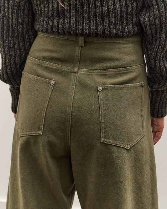 Designed with an exaggerated curved leg silhouette, the pronounced and unique shape is flattering and distinct. Cut from a sand-washed cotton canvas with a firm and smooth handfeel. Features a button zip fly closure, side seam pockets, belt loops, and single pleat at the front. Also available in Washed Olive. FIT Cara is 5'7 and typically wears a size 26 in bottoms. She's wearing the size XS here for a fit that sit higher on the waist. This trouser features a fixed waistband that offers minimal stretch in the waist and hips – we recommend referring to the measurements below as a guide when choosing your ideal size and fit. If between sizes, there are belt loops to secure the waist to the desired area of wear. Graded in gender-neutral sizing, the size XS is comparable to a standard women's size S. APPROXIMATE SIZING XXS - Waist: 24", Hip: 38", Rise: 14", In-seam: 26"XS - Waist: 26", Hip: 40", Rise: 14.5", In-seam: 26"S - Waist: 28", Hip: 42", Rise: 15", In-seam: 26"M - Waist: 30", Hip: 44", Rise: 15.5", In-seam: 26"L - Waist: 31", Hip: 46", Rise: 16", In-seam: 26"XL - Waist: 32", Hip: 48", Rise: 16.5", In-seam: 26" DETAILS Made in small batch in Guangzhou City, China100% CottonHand wash cold and lay flat to dry
