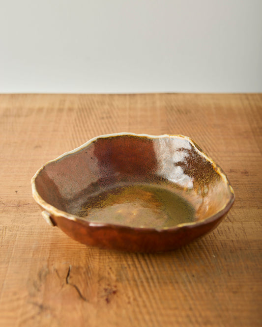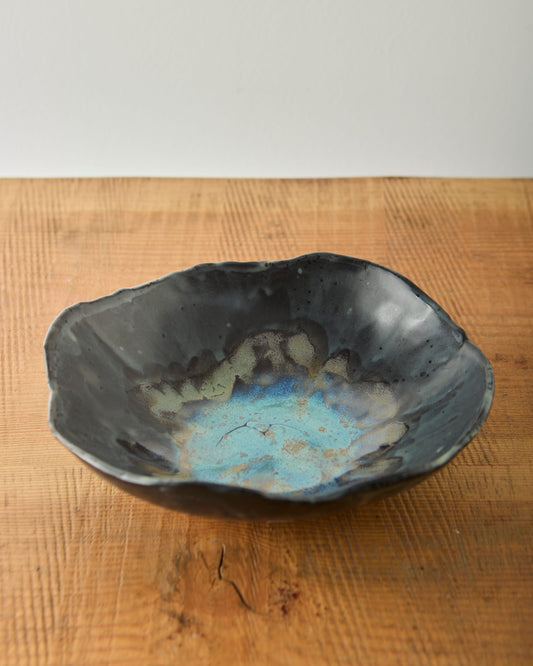 A circular bowl, hand-built with organic edges and unique glazing design inspired by nature's topography. Well-suited for dinnerware or used as a decorative object. This is a one of a kind design. SHIPPING NOTICE Due to the delicate nature of handmade ceramics, all art pieces shipped are final sale. Please contact us if you have questions about the piece before purchasing. DETAILS Handmade on Orcas Island, WACeramic~ 9” W x 2.5” H