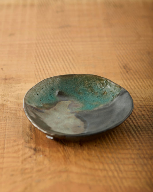 A circular plate, hand-built with an organic shape and unique glaze design inspired by nature's palatte. The wood-fired finish creates depth and unpredictable color variety in the glaze. Well-suited for dinnerware or used as a decorative object. This is a one of a kind design. SHIPPING NOTICE Due to the delicate nature of handmade ceramics, all art pieces shipped are final sale. Please contact us if you have questions about the piece before purchasing. DETAILS Handmade on Orcas Island, WACeramic~ 5” W x 1” H