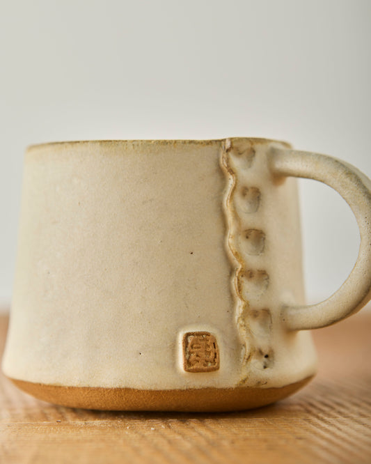 A ceramic cup, hand-built with a slight curvature to the shape that has an overlapped design with an interesting seam near the handle. Bottom texture is unglazed and visible. Edges are burnished. Finished with an unglazed artist seal. No two are exactly alike. SHIPPING NOTICE Due to the delicate nature of handmade ceramics, all art pieces shipped are final sale. Please contact us if you have questions about the piece before purchasing. DETAILS Handmade on Orcas Island, WACeramic~ 4.75” W x 2.75” H