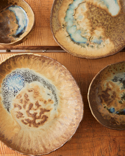 A set of organically formed plates and bowls that would work as serveware or for plating individual dishes. Each piece is wood-fired to bring out the depth in the glaze and to create and interesting patterning throughout. One of a kind set. details Made on Orcas Island, WACeramicXS - 4" W x 2" HS - 5.5" W x 1.5" HM - 7" W x 1" HL - 8" W x 1"