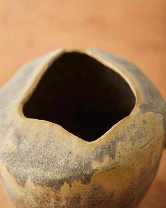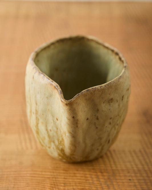 A small, hand-built tumbler with a bulbous shape and pinched waist. Featuring an organic finish and unique glaze inspired by nature's palatte. The wood-fired finish creates depth and unpredictable color variety in the glaze. Well-suited for dinnerware or used as a decorative object. This is a one of a kind design, no two are exactly alike. SHIPPING NOTICE Due to the delicate nature of handmade ceramics, all art pieces shipped are final sale. Please contact us if you have questions about the piece before purchasing. DETAILS Handmade on Orcas Island, WACeramic ~ 3” W x 3.5” H
