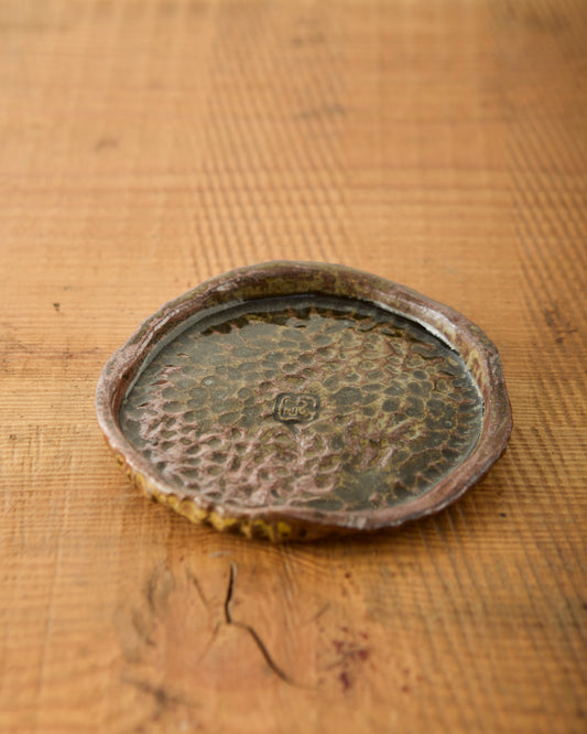 A circular plate, hand-built with a raised rim design and unique earthy glaze. Plant base has a finger-pressed texture throughout. The wood-fired finish creates depth and slight color diversity in the glaze. Well-suited to use within a dinnerware collection or as a decorative object. This is a one of a kind design. SHIPPING NOTICE Due to the delicate nature of handmade ceramics, all art pieces shipped are final sale. Please contact us if you have questions about the piece before purchasing. DETAILS Handmade on Orcas Island, WACeramic~ 5” W x .5” H