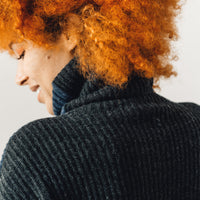 A funnel neck ribbed sweater that featured color-blocking on the sleeves and back, contrasting a navy with black. The silhouette has dropped shoulders, a straight hem line, and swingy shape.