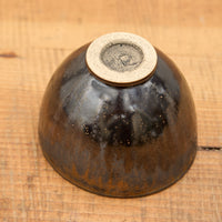 A rounded tea cup that fits nicely in the hand and could double a small bowl. Created from a mixture of clay and porcelain. The metallic sheen comes from the use of iron, and copper as coloring materials when fired at a high temperatures.