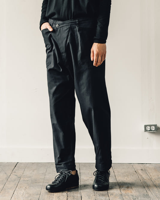 A super relaxed fit pant, constructed from a lightweight cotton twill blend. Featuring a tapered leg, front and rear patch pockets, and a draw sting waist. Design features, such as a gusseted rise for comfort and triangle button fly, add to the uniqueness of this garment while providing comfort. Finished with button and tab cinches on the hem for different styling options.