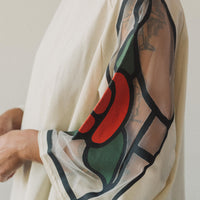 Slightly boatneck, this oversized tee has a raglan sleeve and features see-through geometric panels, unique to each side. This artful piece has the illusion of stained glass. Light and breezy, this piece is easy to style. Try it with a slight front tuck.